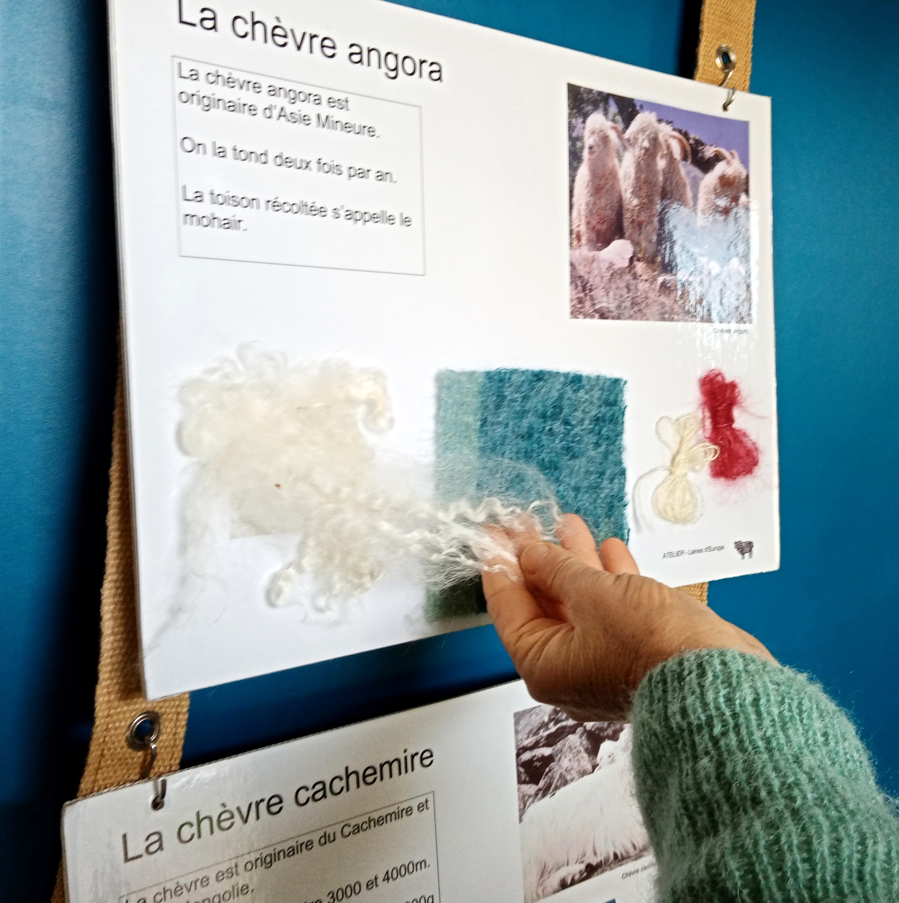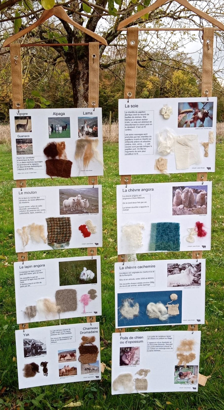 Chaque panneau se compose d’un titre, d’une courte explication, de photos, d’échantillons de fibres et de produits issus de ces fibres.